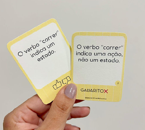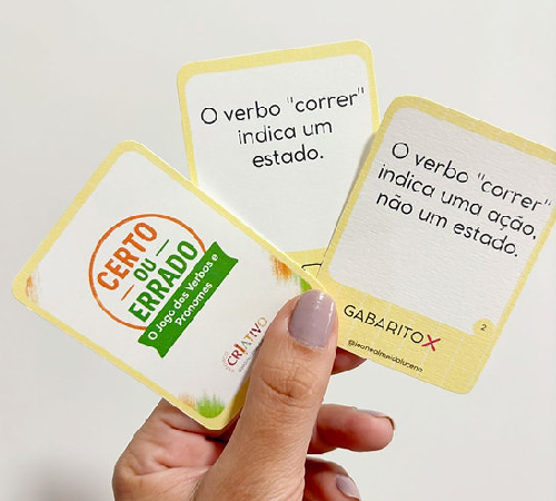 Com três tipos de cartas (Certo, Errado e Desafio Gramatical), o jogo propõe que os alunos analisem frases, identifiquem se estão corretas ou não e utilizem plaquinhas de “CERTO” e “ERRADO” para responder — como em uma dinâmica de Falso ou Verdadeiro. Se o jogador errar, entra em ação uma carta de Desafio Gramatical, deixando o jogo ainda mais envolvente e educativo.
